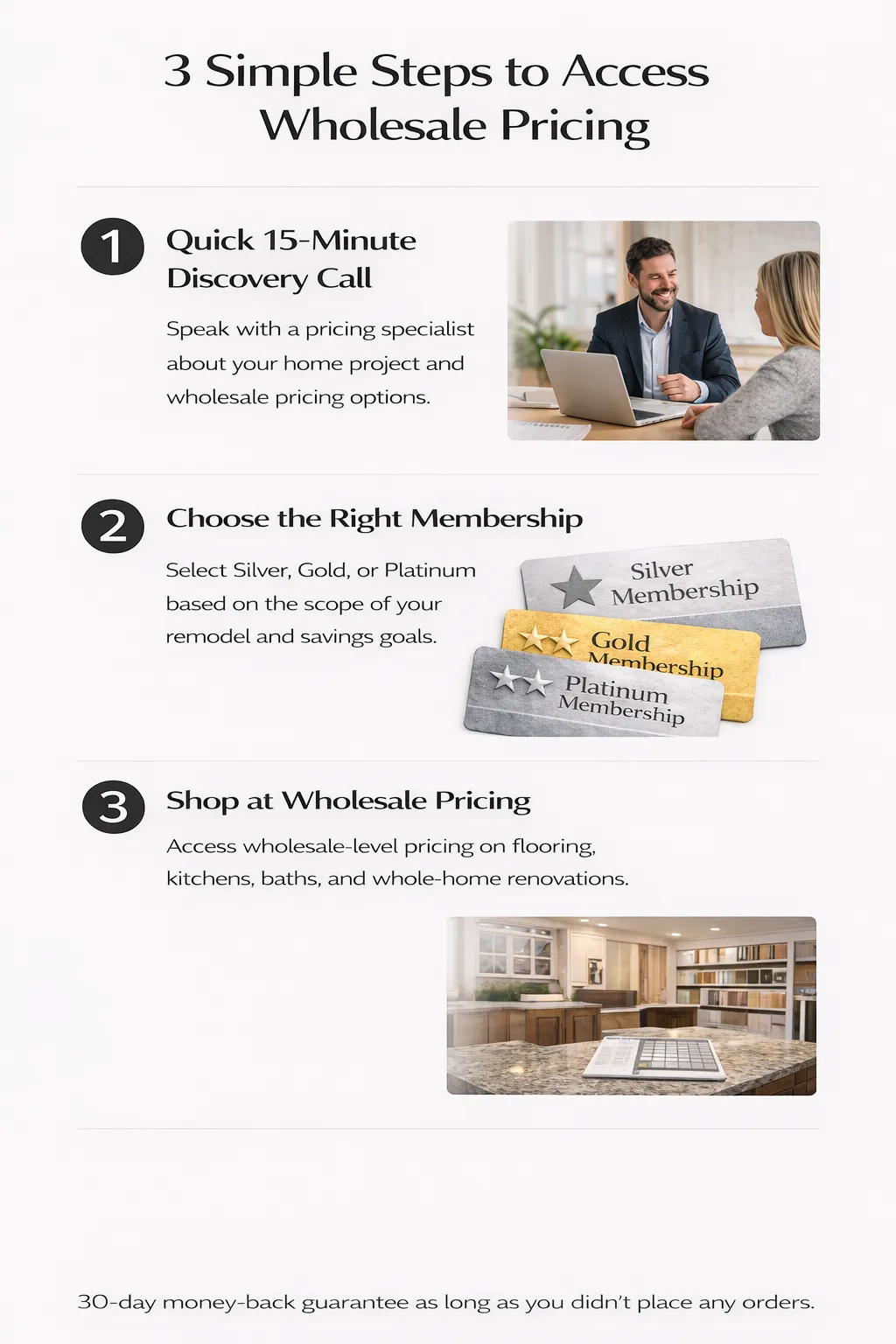 Yes, you keep your preferred contractor or designer and use your membership to source materials. They still handle design and installation; you just don’t overpay for the products themselves. We can also help you find a local contractor to bring your project to life.