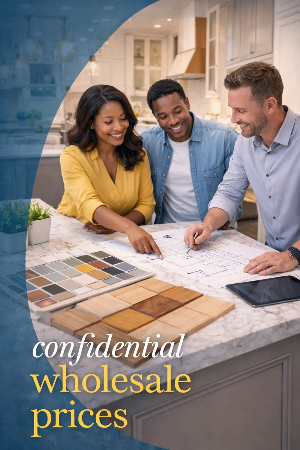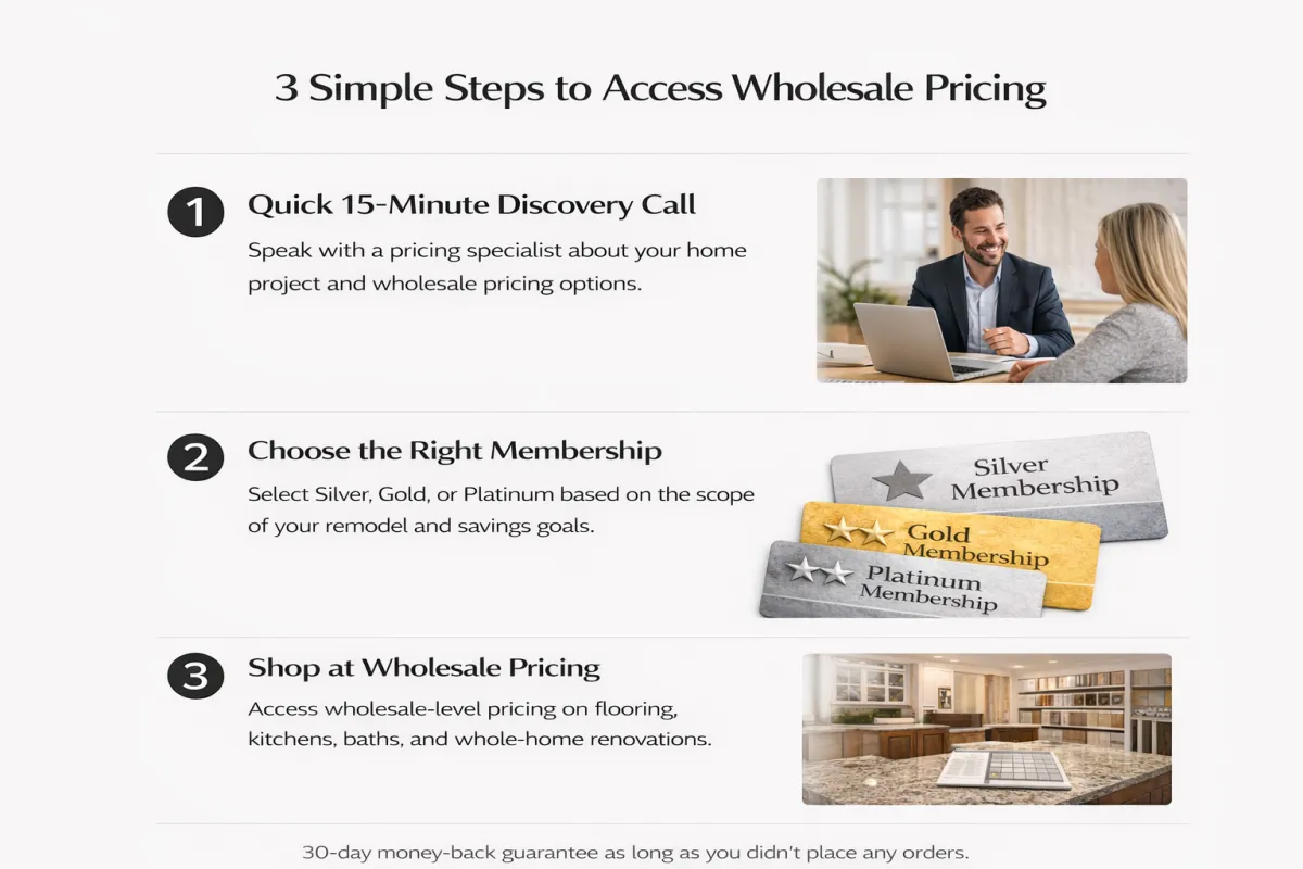 We are entirely sustained by the membership dues. Our focus is on the long-term relationships, not squeezing margins out of every cabinet or faucet you buy. That’s why we can pass along wholesale pricing instead of retail price tags. All rebates and monthly promotions go to the member not the Club. You pay what we pay and not a cent more. We receive NO kickbacks or incentives for your materials, designs, delivery or labor.